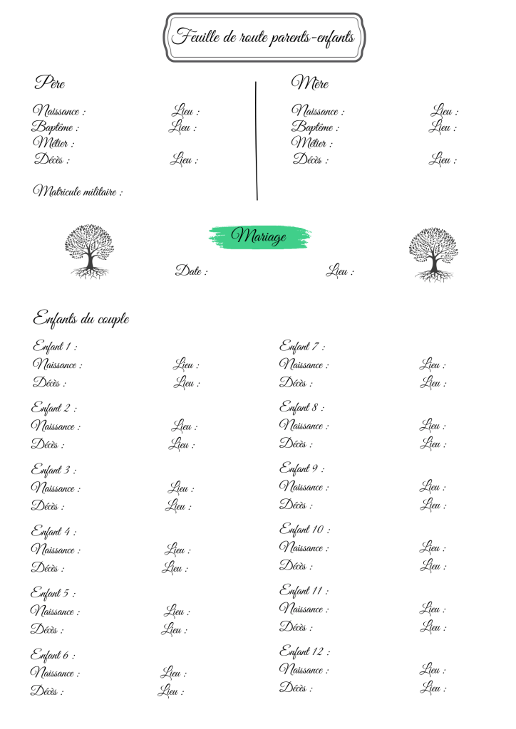 Vous souhaitez avoir une vision complète de vos ancêtres regroupant les dates de naissance, de mariage et de décès mais également les professions et autres informations diverses (sur dossier).